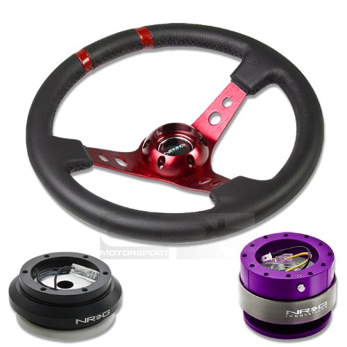 NRG-SRK-110H+016R-RD+200PP, NRG Innovations 13.78" 350mm 3" Deep Dish Style Black Leather Red Center Marking Red Spokes Racing Steering Wheel Combo with 6 Hole Short Hub Adapter with Gen 2.0 Purple Quick Release Kit SRK-110H